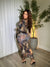 • The dress is a striking long-sleeve, bodycon midi dress with a bold, multicolored marble print in swirls of brown, black and a hint of green. It features a daring lace-up front design across the chest, creating a deep plunging neckline with cut-out detailing beneath the bust. The fabric hugs the figure, emphasizing curves, while the length falls below the knees for a sleek, elongated silhouette.