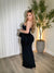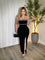 This dress is a sleek, strapless black evening gown with a timeless, ultra-glam silhouette. It features a straight bandeau neckline that highlights the shoulders and décolletage, accented by sparkling rhinestone trim along the bust and waist for a touch of elegance and definition.