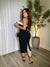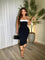 The dress in the image is an elegant strapless midi dress that exudes sophistication and femininity. It features a form-fitting silhouette that accentuates the wearer’s curves, creating a sleek hourglass shape. The bodice is strapless with a striking white panel detail across the neckline, highlighted by a structured bow accent that adds a touch of charm and contrast to the all-black body of the dress.