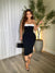The material appears to be a smooth, stretchy fabric—likely a blend of polyester and spandex—offering both comfort and contour. The length falls just below the knee, giving it a classy, cocktail-ready feel.