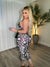 This figure-hugging jumpsuit features a sleek halter neckline that frames the shoulders and neckline while creating a smooth, sculpted fit through the bodice. The fabric appears soft and stretchy, contouring closely to the body and highlighting the natural silhouette from the waist through the hips and legs. A playful pattern of mixed-size circular dots is scattered across the entire piece, adding visual movement and a bold, modern feel. The legs are fitted and tapered, ending at a cropped mid-calf length for a streamlined finish. From the back, the jumpsuit reveals a dramatic open-back design with the halter strap wrapping behind the neck, leaving the back exposed and emphasizing the curve of the waist and hips.
