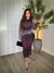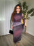 The dress in the image is a body-hugging, long-sleeve midi dress with a sheer mesh overlay. It features a gradient ombré color effect, blending deep tones of plum, mauve, and smoky gray with subtle hints of rose undertones. The fabric appears to have a stretchy, semi-transparent texture that contours the body, creating a smooth and sculpted silhouette.The dress has a crew neckline, fitted sleeves, and a ruched effect around the waist and hips that accentuates curves beautifully. The length falls below the knee, offering a balance between elegance and allure.